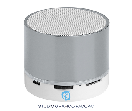 Speaker bluetooth personalizzato in alluminio e plastica. Con questo gadget personalizzato i vostri clienti potranno ascoltare la musica durante le loro sessioni sportive senza cavetteria comandando il tutto comodamente dal proprio cellulare, per un allenamento più intenso e costante. Lo speaker bluetooth è disponibile nelle colorazioni bianco, nero e argento.